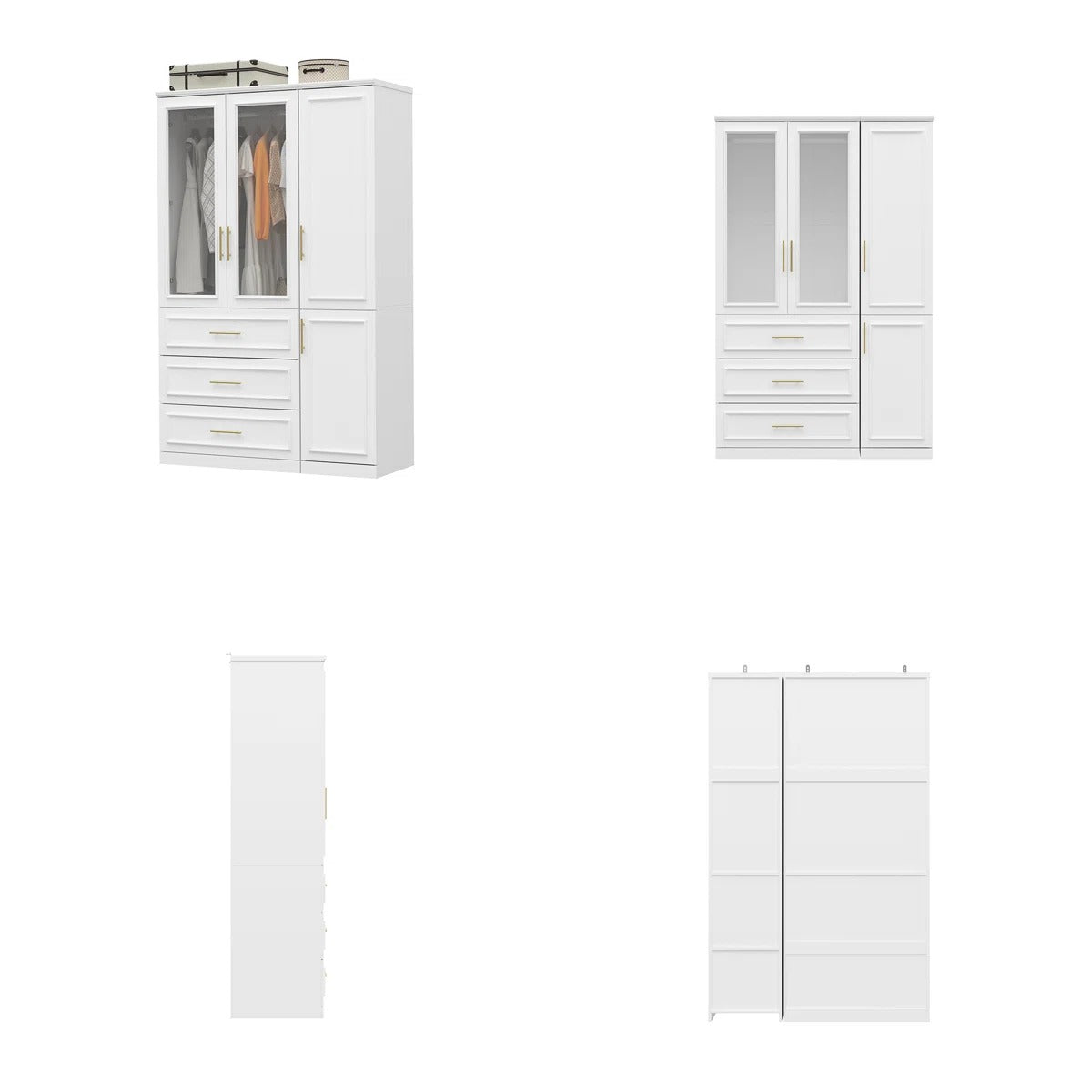 Material: Durable Engineered Wood, White Finish, Clear Glass Door Panels, Gold-Toned Metal Bar Pulls